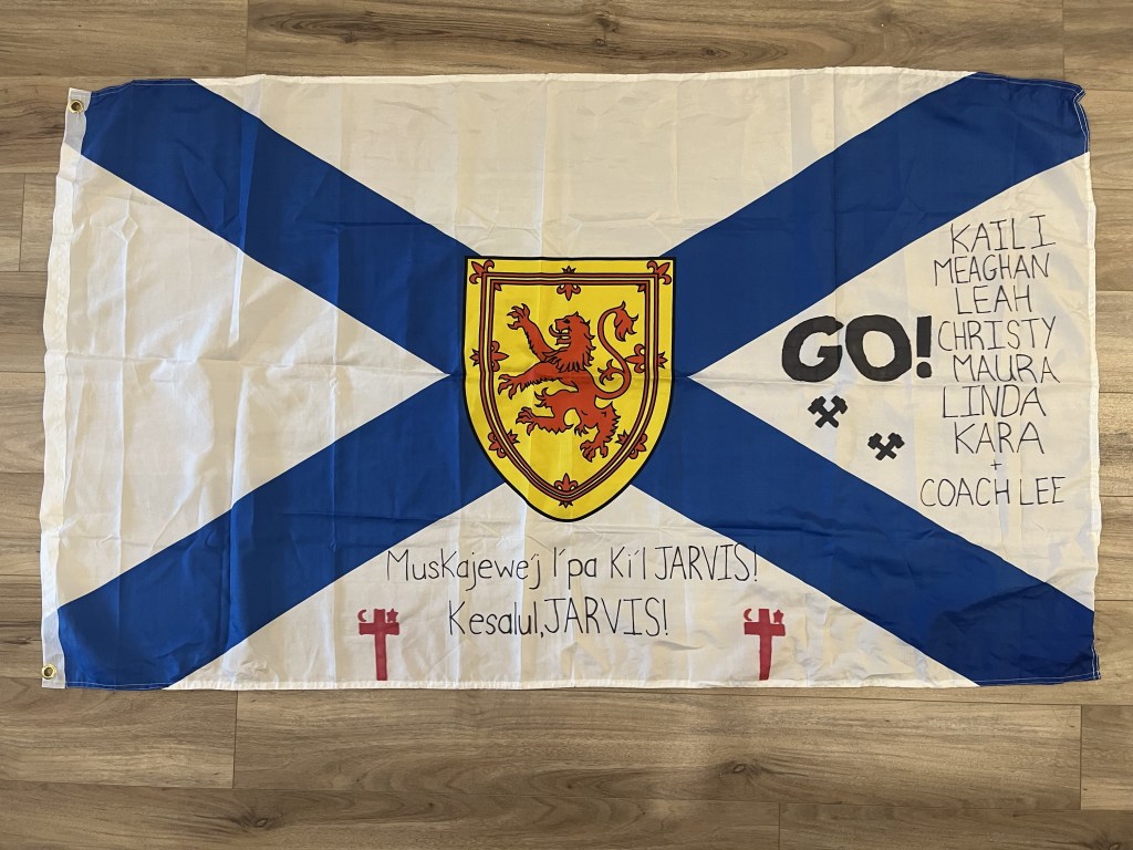 Once I got into Natick, I spotted fellow undergrad and law school alumnus and runner Marc LeClair (who told me that he was driving down to cheer on fellow Nova Scotians). He held up a large Nova Scotia flag with various runners’ names from the province on it, and had a message written for me in Mi’kmaw: “Muskajewej l’pa ki’l Jarvis. Kesalul,” which translates to, “You are excellent. I love you.” I absolutely appreciated it. At about three kilometres after that, I saw Kerri, holding up the sign that she made for me two days before at the expo. It was another piece of motivation that I was grateful for.