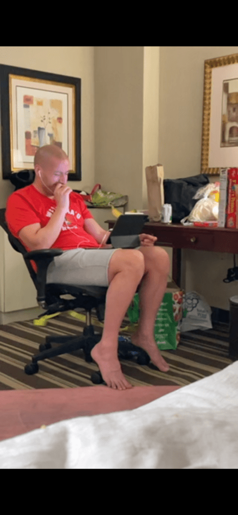 Sunday morning I did a shakeout on the same trail behind the hotel and then went for breakfast. We returned and I started to carb load and rest up. Lots of Gatorade, Skittles (which I consumed along the drives), and breads. I spent most of the day laying on bed, texting and chatting with folks (including Jennie, Coach Erin, Patti, and several others from home), doing some video calls, and watching YouTube videos that was both emotional and funny. That evening, I went outside to smudge with some sweetgrass. I also tried a peanut butter and jelly sandwich with pineapple, bananas, and Skittles. Not as great or awful as it sounds; just a bit messy. Unfortunately, as with the last few days, I didn’t get the best sleep, although it was nice to smell the sweetgrass as I had on the nightside next to me.