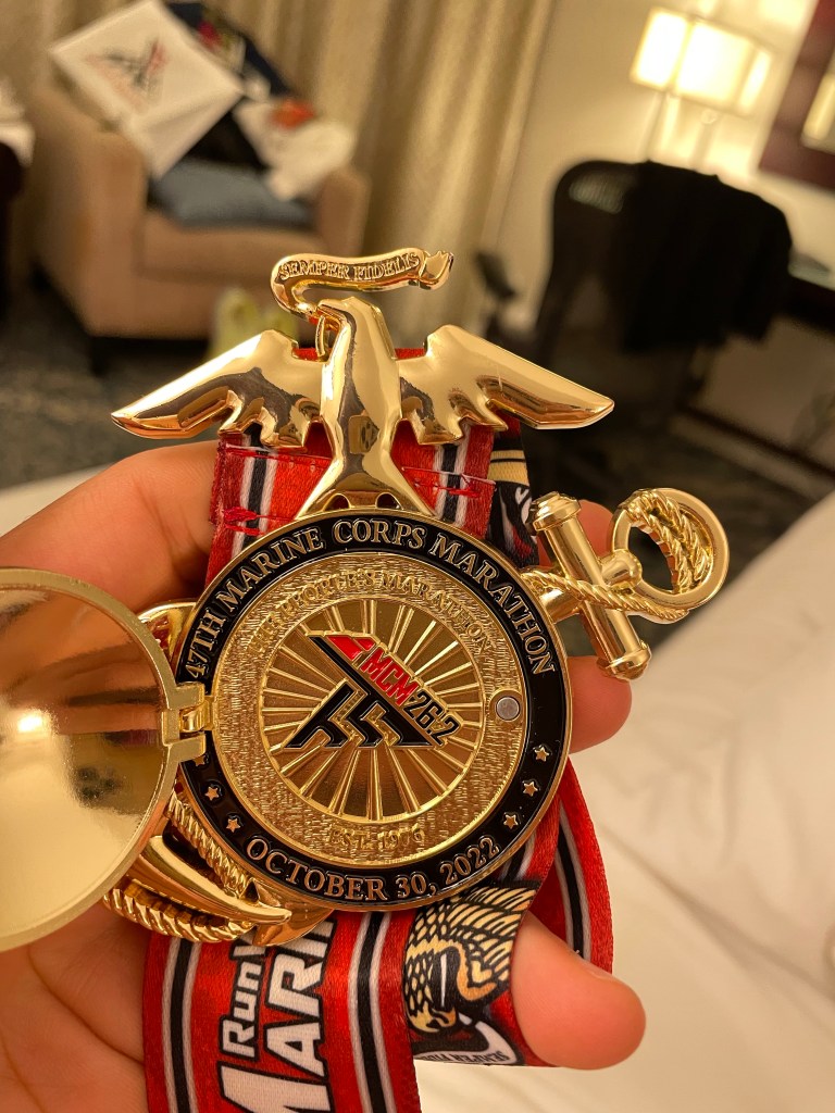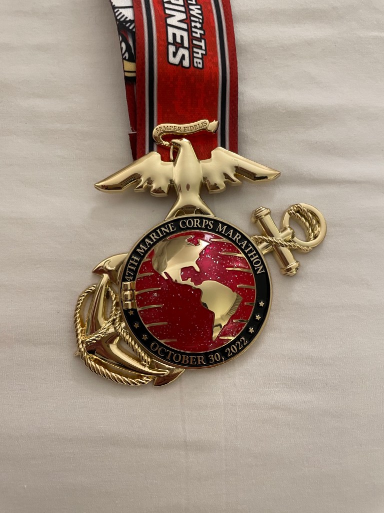 Speaking of beautiful, I’ve completed numerous races since 2016, and the medal that you earn at the Marine Corps Marathon is probably one of the most beautiful designs that I have ever seen. The Eagle, Globe, and Anchor was simply gorgeous (hours later I learned that it even opened up). If you love racing for medals, this is one you may want to earn one day.