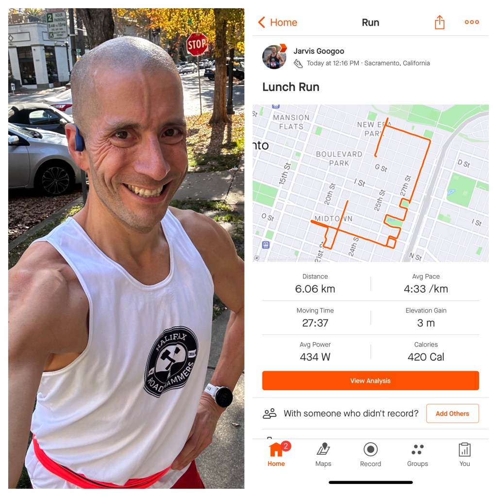 November 29 was my was day to fly out. To avoid the stresses of last year’s commute to the Marine Corps Marathon and leading up to Fredericton, I did a lot of Breath Work. I arrived in Sacramento very late and just did an Uber Eats without much research. The next morning (and running off of five hours of sleep), I went to a nearby IHOP to begin the carb-loading with a massive and delicious breakfast. The waitress even told me afterwards that she was asking herself if I was capable of finishing everything. With the upcoming marathon, there was no doubt. As it was Thursday, I opted to walk over to Target (my favourite place to stock-up on marathon prep supplies in the United States). Along the way, I saw many tents and camps re homeless people. It reminded me so much of Kjipuktuk/Halifax, and my heart went out to them. Target took about two hours as I did extra research while shopping. Plus with costs, I tried to keep things economically sound. Once back I did my Thursday 6K. I saw others running and one guy yelled as I passed by “CIM?” I shouted back yes and he cheered me on. I did have a short emotional moment. While running, Hearts on Fire started on my playlist, and knowing that Clint lived in California while he was in the Marines, I cried a bit mid-run. I also saw a sign that read, “Be Kind,” which reminded me of Kerri’s mother Ann Marie. Running in the warmer temperatures was incredible and felt wonderful. Back at my AirBNB, after some cooking and prepping, I honestly don’t think that I may ever want to do a regular hotel again when traveling for several days for a marathon. The toaster, stove, large fridge, extra space, etc… are all very convenient.