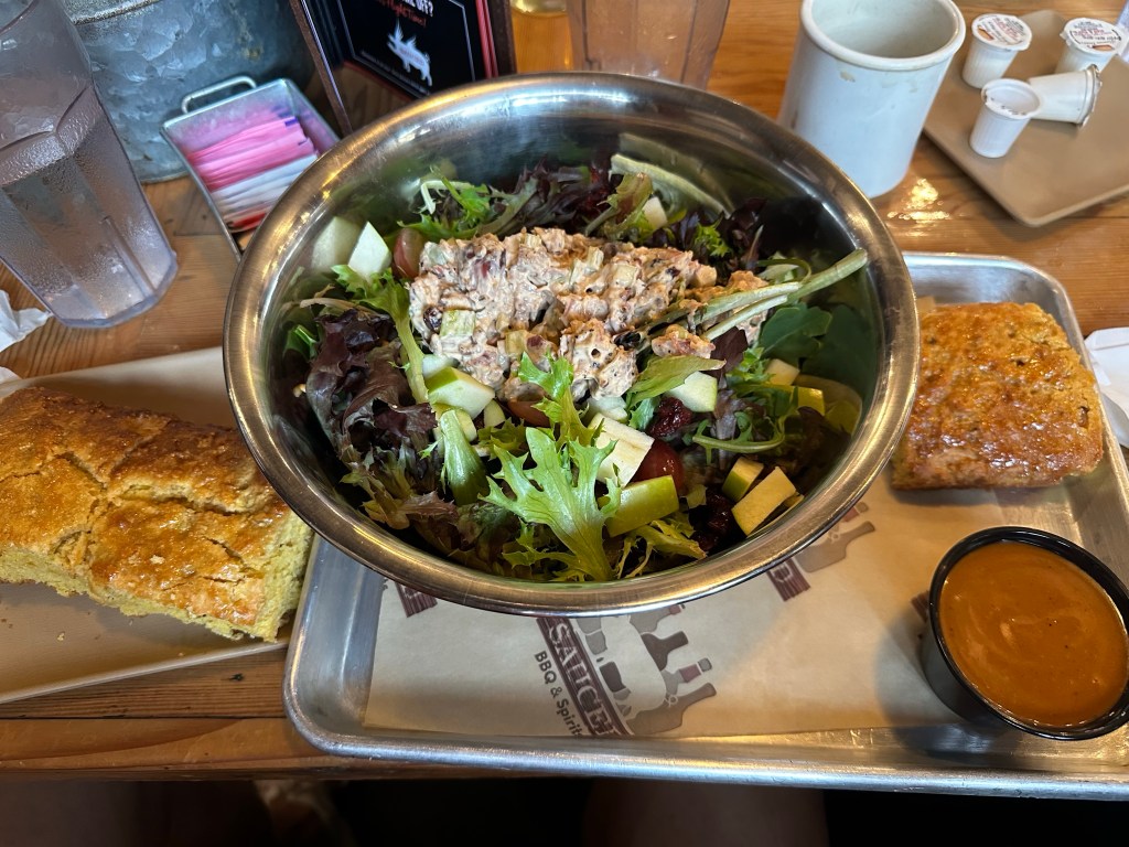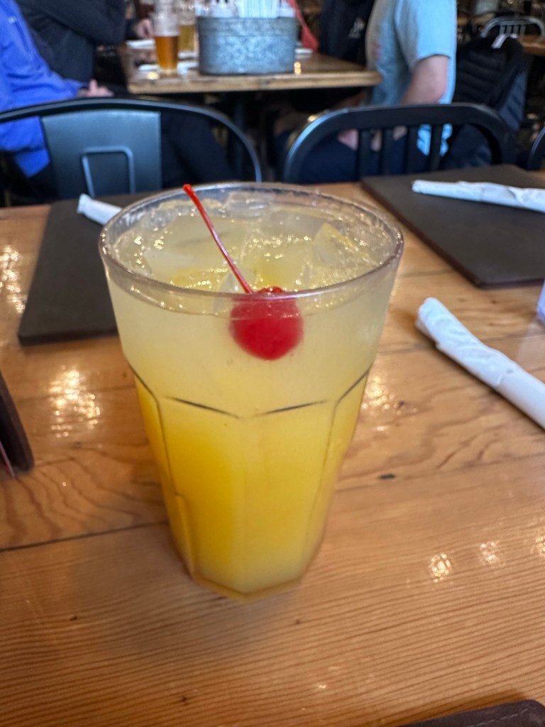 Once done, I went to the usual slow walk to help with the recovery. I waited a few minutes because I did pass Liz not that long ago. I met up with and congratulated her. Walking along, I was happy that I wasn’t too achy nor sore, and did I not want to get sick (a feeling I’ve had when doing other races with a strong finish). I have definitely gotten stronger re post-marathon recovery, and I felt the strength that morning. We got some pictures done and gathered to try and group with the other Road Hammers. In due time, more and more of the team gathered around. Christy reserved a table for us at Sauced BBQ & Spirits to celebrate post-marathon. Ryan and I arrived first and early (I opted not to return to my place right away), chatting along the way about probably being some of the few folks from Unama’ki/Cape Breton Island doing CIM that day, and how grateful we were to be here. Soon others arrived, and I ordered what was probably the best turkey salad to date that I ever had in a restaurant, a sweet passionfruit drink, delicious cornbread, and awful coffee (which the waitress warned me about). We all shared and discussed CIM, what we liked, where things were tougher than expected, and potential future marathons. But as always; we congratulated each other on completing the race – regardless of the finish time – because doing a marathon is always an achievement.