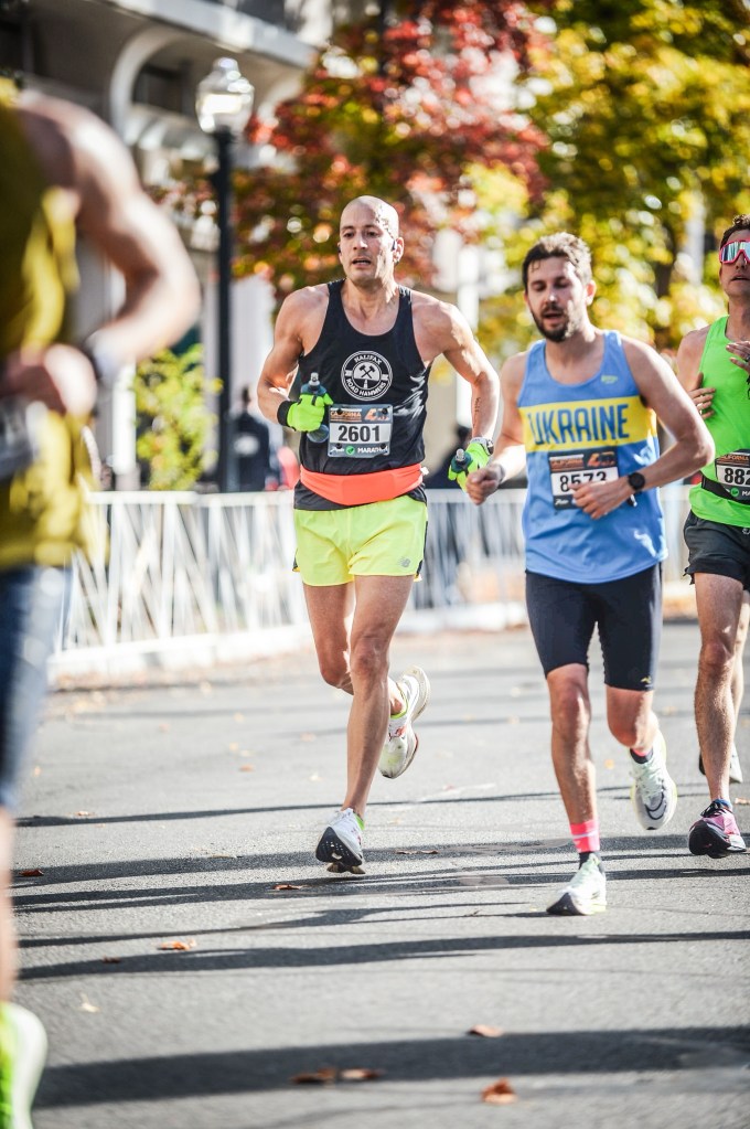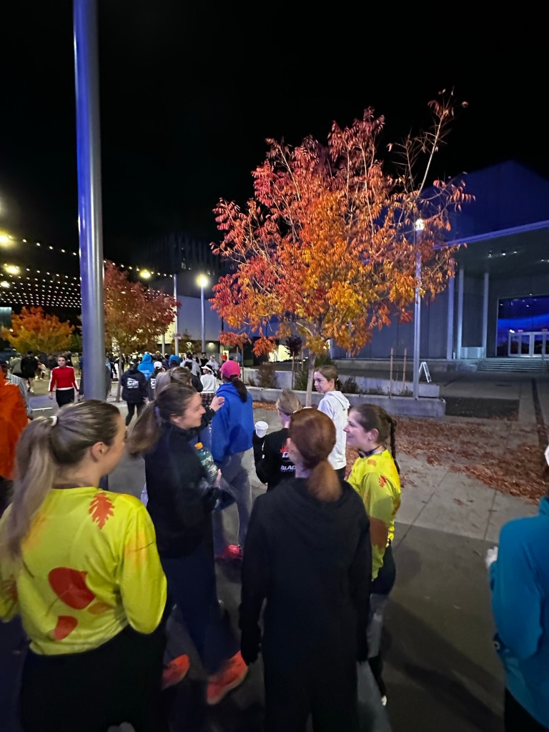 With seven hours of sleep, I woke up on Sunday at 2:45 a.m. Unlike Boston, Marine Corps, and Fredericton, my Garmin vitals raged from good to excellent. Definitely a confidence booster. Giving myself about four hours before racing, I had a bagel, banana, 240 millilitres of pineapple juice (which I’m not sure if I need that much), and Gatorade. I got a text from Kaili, informing me where the group was meeting up at for 4:15 a.m. Once there, it was great to start seeing other Road Hammers (Sunday was the only day that I would be with the team). We boarded the buses and were off. I opted to rest my eyes en route to the start area. After arriving, we found a spot for us to hang out at and rest/socialize. Soon more Road Hammers appeared and our group got larger. We then heard the announcement that the race was going to start ten minutes late because some of the buses got lost. Christy had a sharpie with her, offering it to whomever wanted to write something on their arm, either numbers re the race or an inspirational quote. Given I knew my plan (which was easy to memorize), I thought that it would be nice to write “Ketkwi’m” (Mi’kmaw for “I run”) inside my left forearm. Little did I know how often I would keep glancing at this for the race.