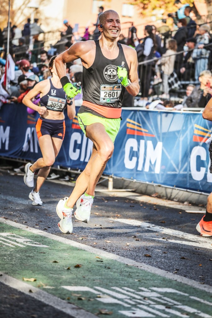 At 32K (three kilometres prior to shifting into high gear), I entered what’s called the “Breakthrough Zone.” It’s a well-known part of the course, and I was feeling good. However, I was sticking with the plan. Coming up to the J Street Bridge, I knew that this was the last climb of the race, and it was all downhill then flat from here on in. Halfway on it, I took another sip from my flask and let out another powerful “ahhh.” Two guys ahead of me cheered me on. Then I hit my 35K mark; it was time to crank it with what I had left. Lee said to pick off those ahead of me, and I did. Running relaxed for the previous 35K worked wonders, because unlike my other marathons, I had a new first at CIM; power, energy, and speed at this distance, and lots of it. I wasn’t tired, and not only did my hamstring not cramp (which has happened), my left one even held out albeit not being 100%. While keeping on pace for the first two major blocks of the plan required a lot of patience and discipline, the last seven felt as if I was “letting loose,” and to simply gradually – not outright – blast forward. I wasn’t exhausted. I wasn’t drained. I was happy and smiling. There was no wall. Lee’s instructions were “whatever you have left, sub 4:03 if it’s there – bodies are key to pick off, and just have to want it.” I had a lot left, and I wanted this – not because of how Fredericton went, but because I love running so much. There were plenty of bodies to pick off, and it was time to gradually pass as many as I could till the finish. The plan was in full effect.