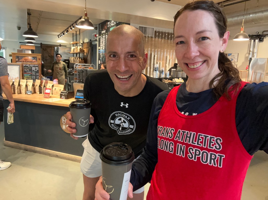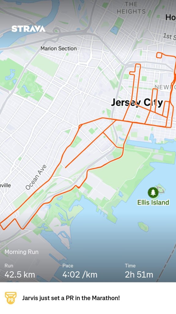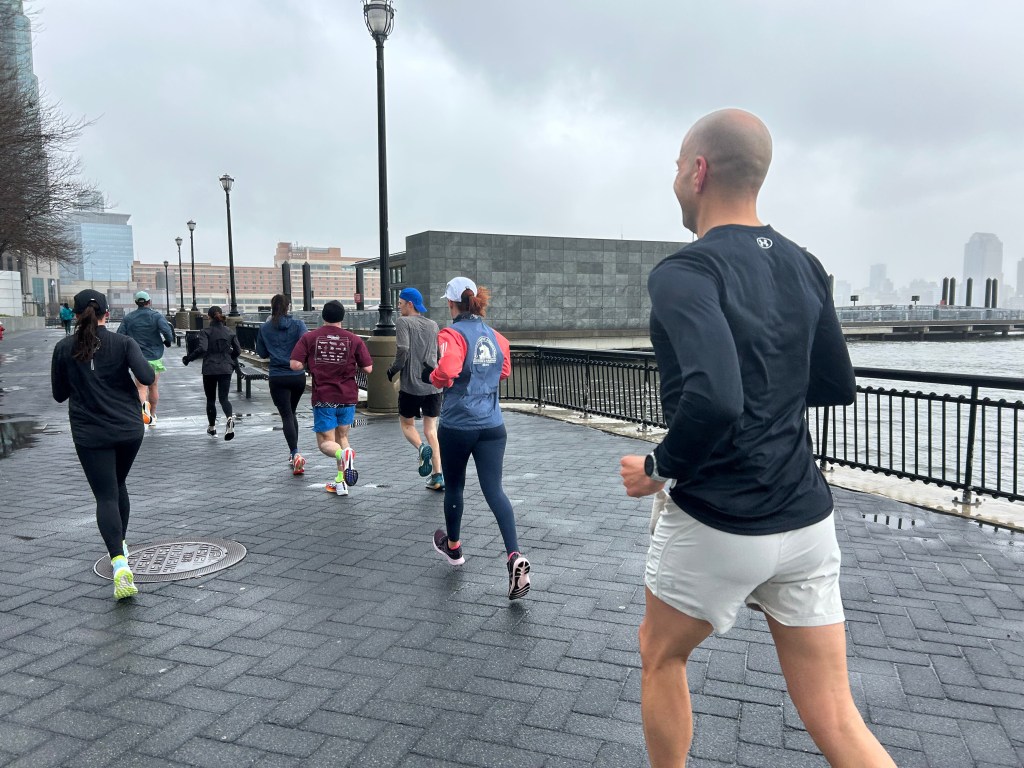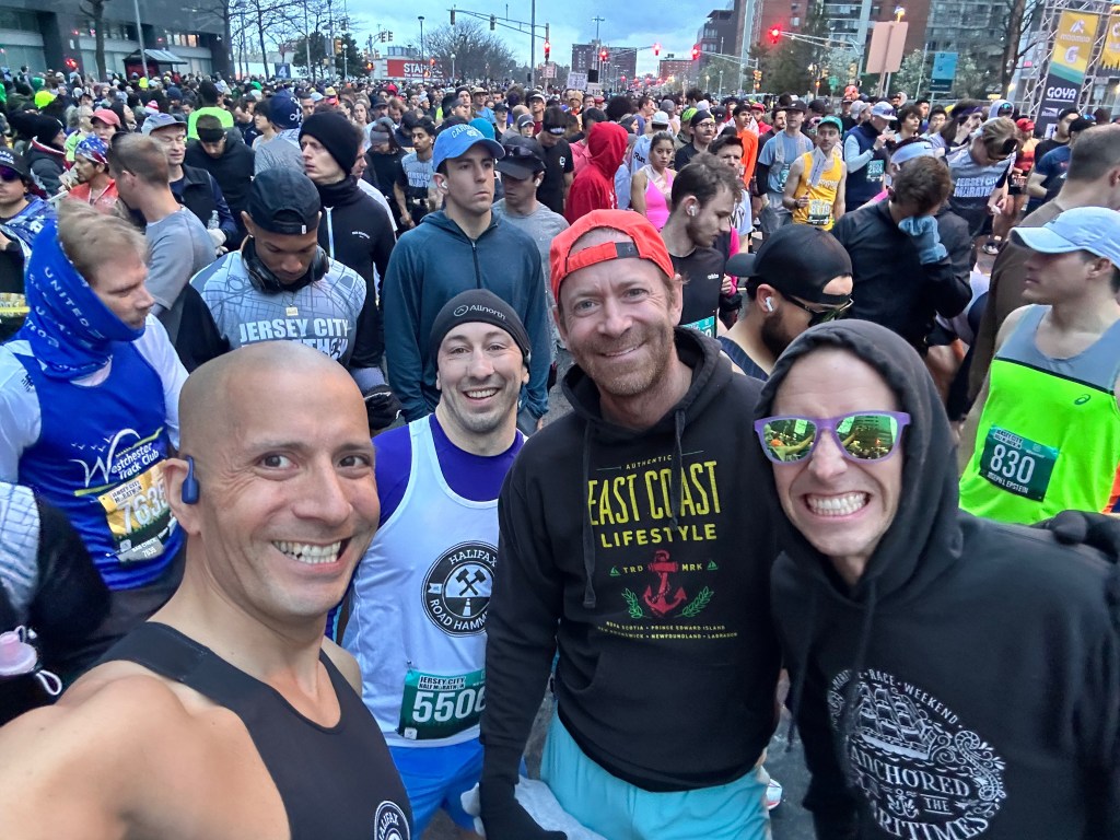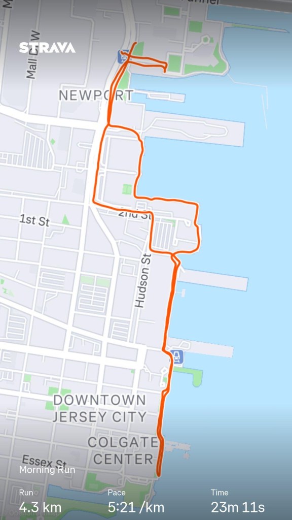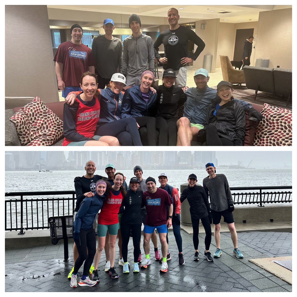 The next morning, I woke up to a Body Batter of 56. While not perfect, it was better than other times where it was lower than usual the day before a marathon (but my sleep felt very good). Several of us did a fun team shakeout along the Jersey City Waterfront. In fact, it was my first time doing one abroad with so many friends and teammates. Afterwards, Erin and I got a coffee and chatted about things, and she gave me the good advice to not view my stats (e.g., Sleep Score, Body Battery, etc…) on marathon morning. I spent the rest of the day doing yoga, eating carbs, and catching-up on production work for season two of Mi’kma’ki.