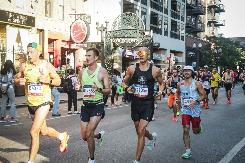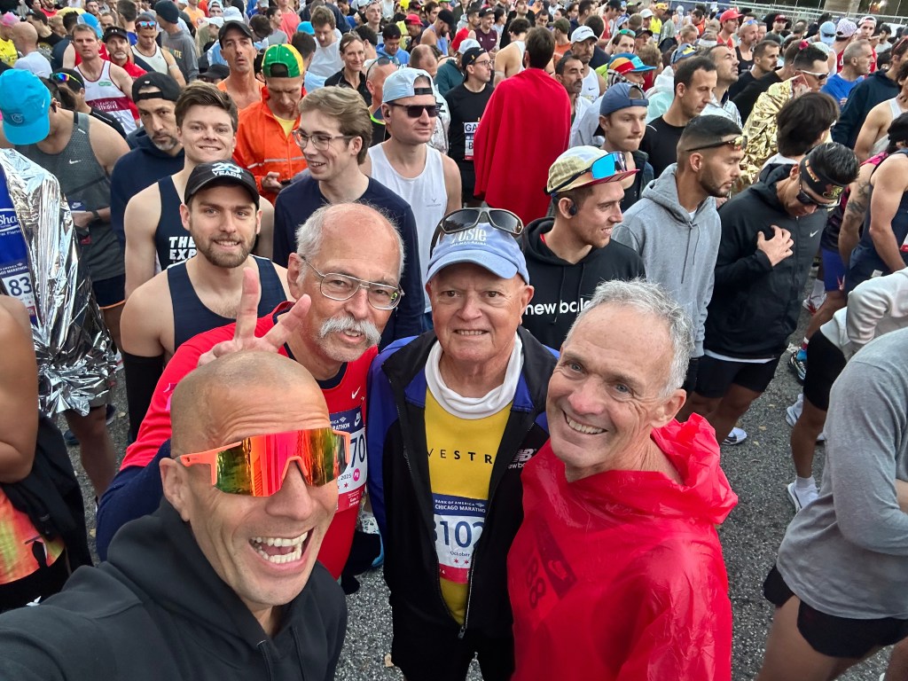 On marathon morning, I woke up for 3:29 a.m. I felt as if I had a very good near eight-hour deep sleep (despite what my Garmin showed). Rather than the full Gatorade bottle, I drank 250 millilitres of mango smoothie and had a bagel with peanut butter at 3:55 a.m. Being just a few kilometres away, I walked to the race start area. While I purchased a Fast Track for quick entry, I didn’t need it as showing-up early sufficed. The day before, Greg (who gave me the idea of the Zürich Marathon) inboxed me some great advice re Corral B and ensuing that I got to the front early. I bumped into Chris and Sarah just outside of the corral, and met up with Tony several minutes later. While waiting to begin, I got to meet the three original starters of the first Chicago Marathon; George Mueller, Randy Burt, and Henry Kozlowski. They were full of energy and excitement. We all were.