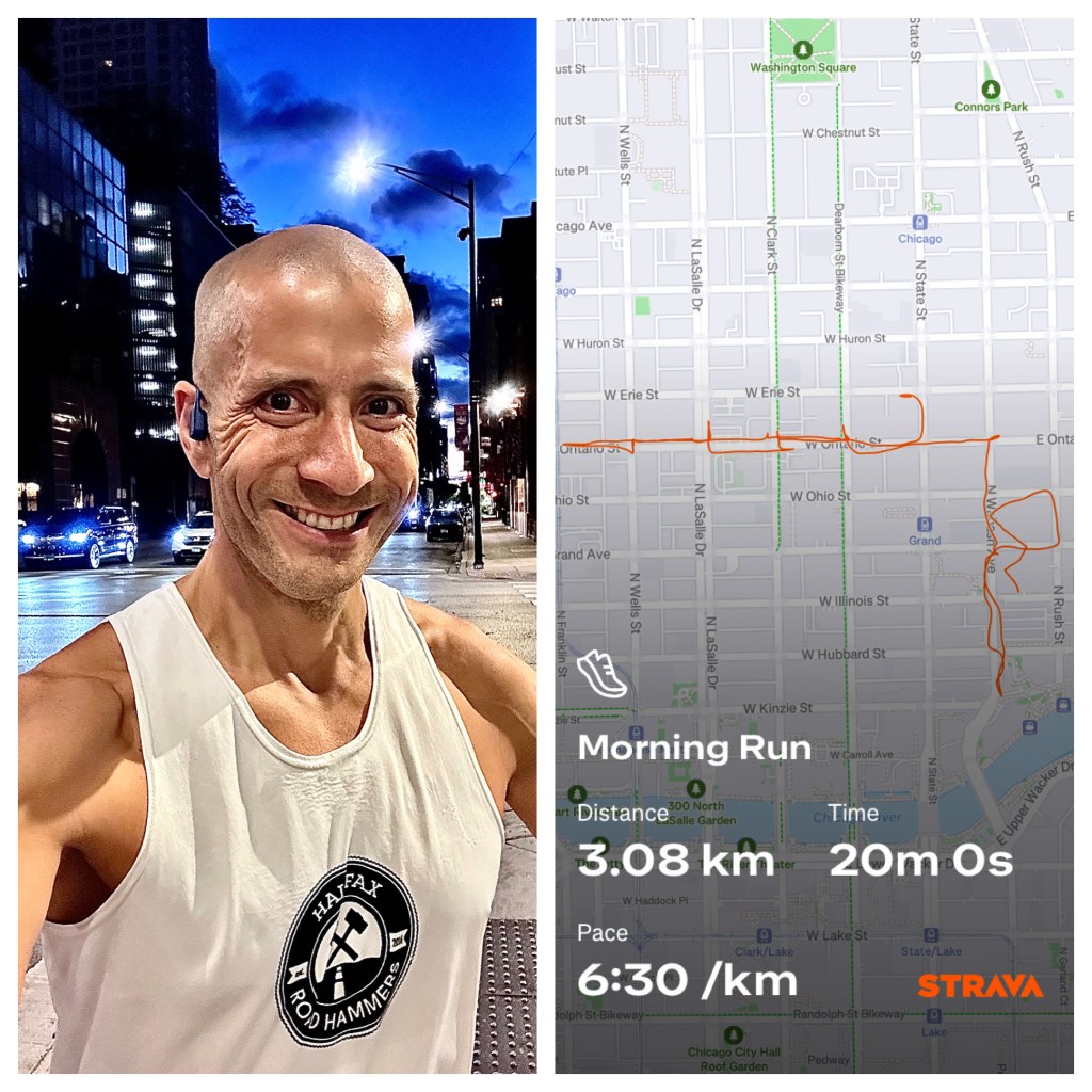 Once done, I started walking (never abruptly stop). The Chicago Marathon was also the least sore I’ve felt to date post-42.2K; no aching nor limping. Aside from a warm head due to the heat, I felt good. Volunteers handed out wet facecloths and I placed one on top my skull. After chugging three bottles of water and getting some fun pictures with marathonfoto, I looked up Chris, Tony, and Sarah on the app. They were still running, so I went to go get my gear. Along the way, I FaceTimed with Kerri to share the good news and how I was doing. I then met up with Sarah. We had a nice chat about the event, losing loved ones, and being grateful to be able to run. Soon Tony arrived and we headed back to our respective accommodations (I was staying at a different hotel that was very close to theirs). I also got to speak with my mother on the phone and told her how I did (with about half of the conversation being in Mi’kmaw).