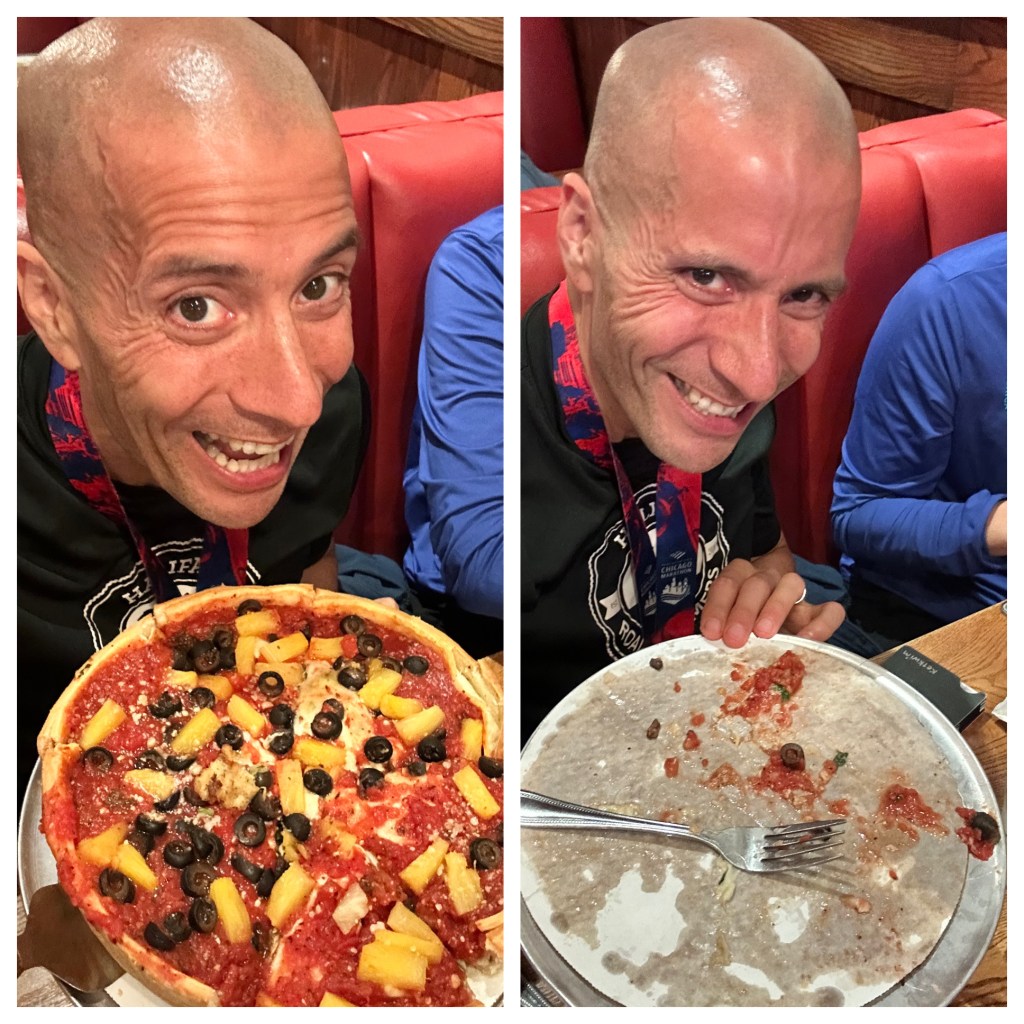 After a short stretch and posting my results on The Social Media, it was time to celebrate and socialize with the crew. We set off to Giordano’s, as I never had a Chicago deep dish pizza in my life. I felt it was only appropriate to finally try it while in the Windy City. I liked it, but it had too much sodium (as it was tough to fall asleep that night). I left dinner a little early as I wanted to walk around to sightsee the city. Strolling along the River Walk, I stopped and sat at the River Theater to reflect a bit on life, culture, growing up in We’koqma’q, running and all the wonderful experiences associated with it, and having only the deepest gratitude for everything. For the entire walk, it was fun to congratulate other runners who also completed the Chicago Marathon. I ended the walk by reuniting with Tanya (and meeting her friends). While the social was a short one (I needed to pack as I had an early flight), it was lovely to catch-up with her.